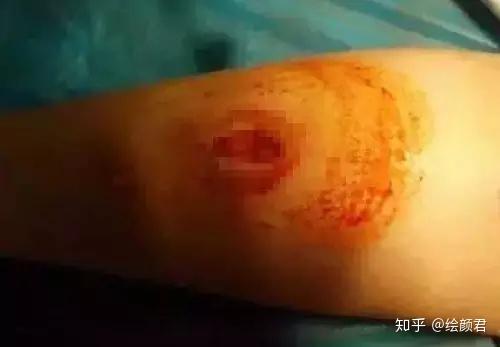 腿部大量注射引起组织广泛炎症性反应,中间已经坏死,皮肤溃烂。